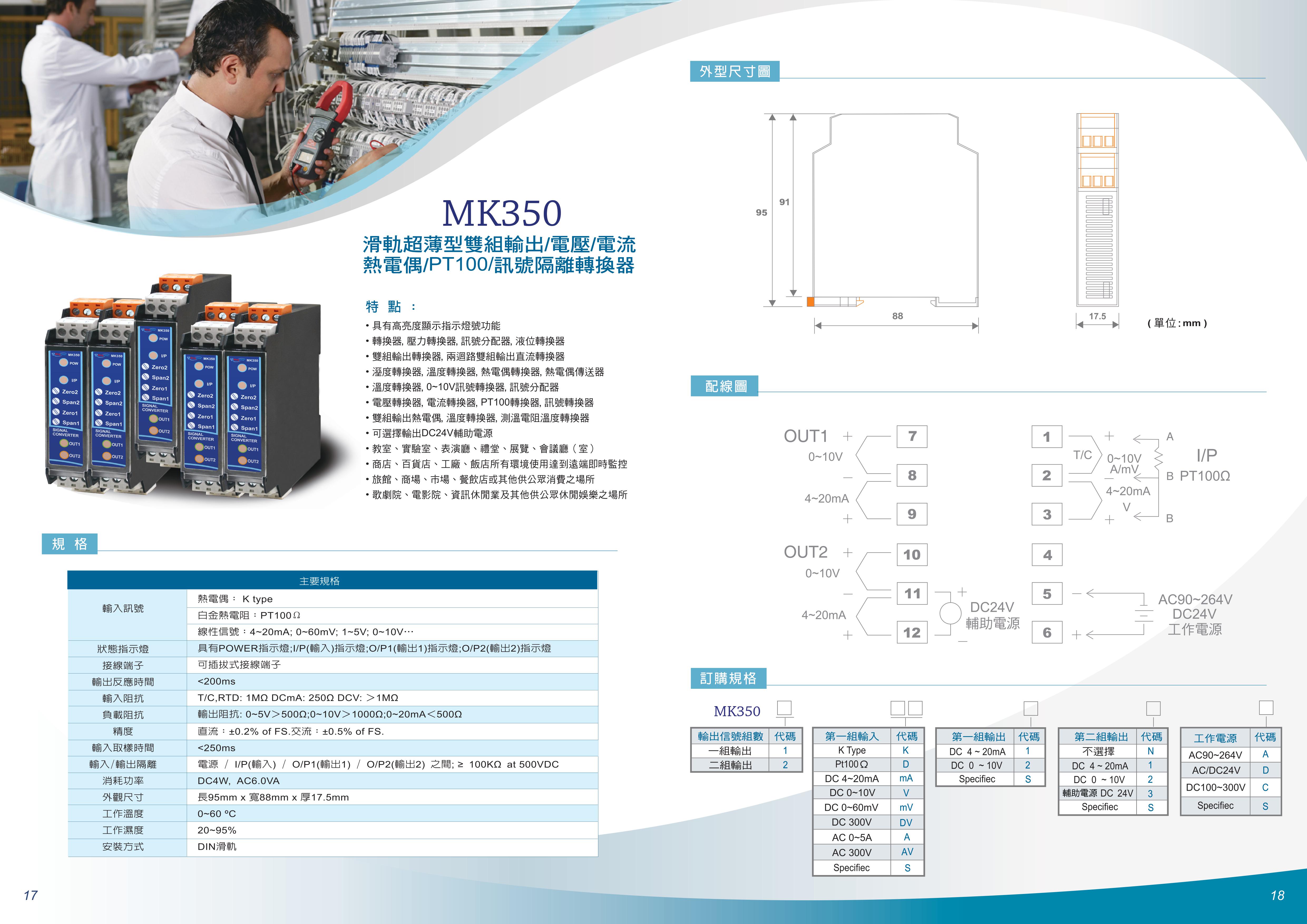 MK350滑軌超薄型雙組輸出電壓/電流/PT100/熱電偶