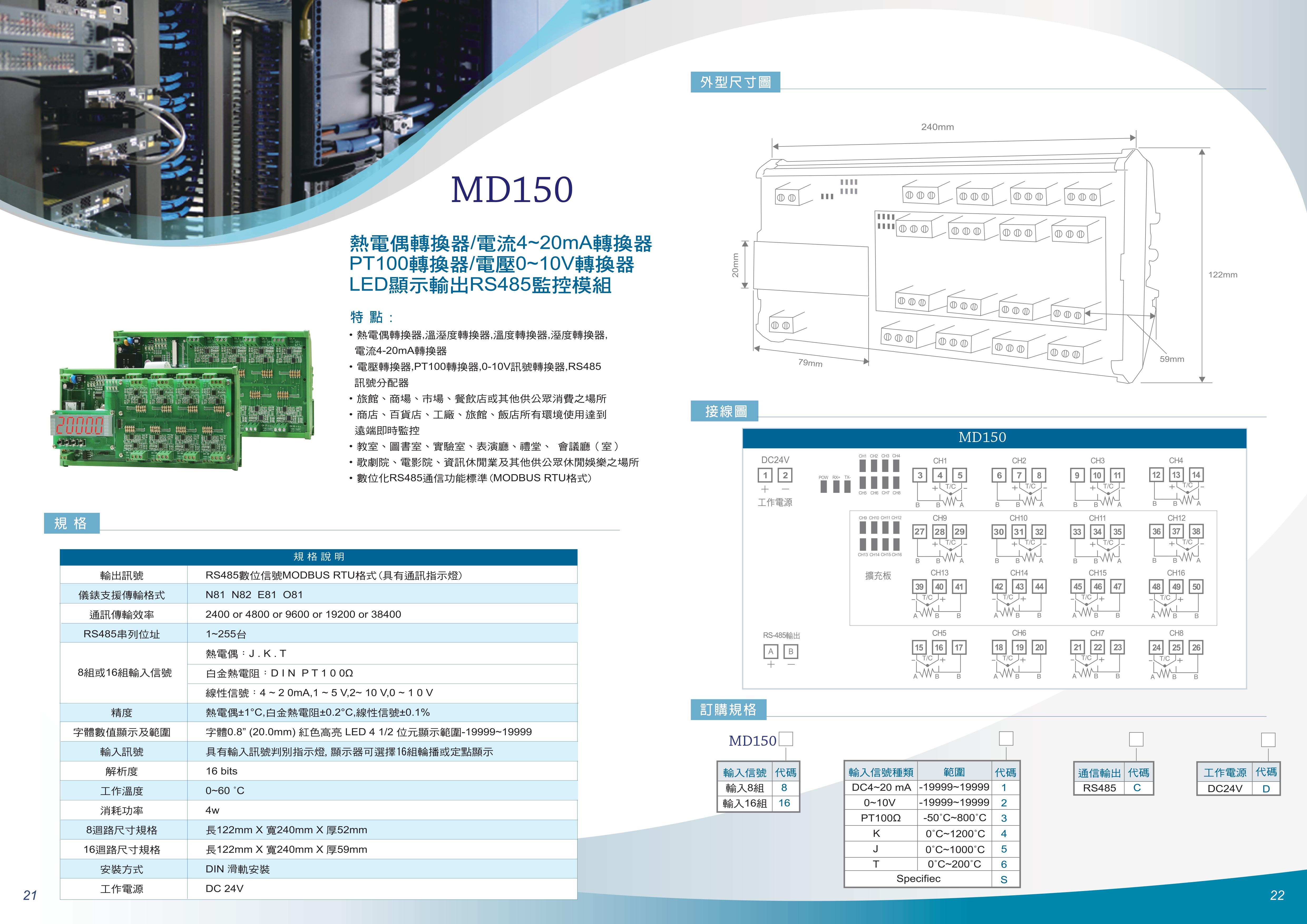 MD150 16迴路循環顯示器/熱電偶/PT100Ω/電壓/電流/輸出RS485監控模組