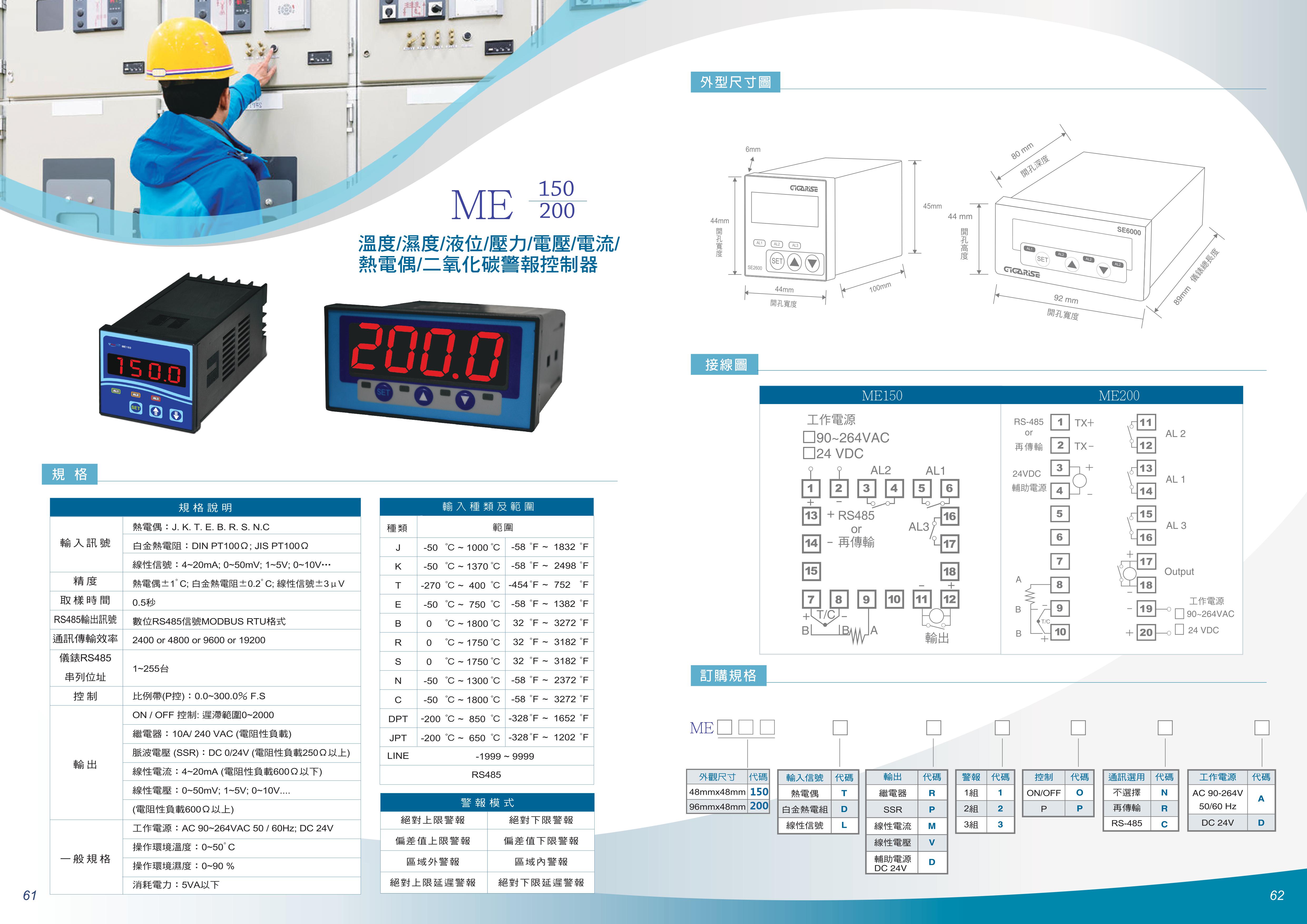 ME200溫度/濕度/液位/壓力/電壓/電流/熱電偶/二氧化碳警報控制器